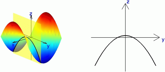 Cutting the surface by the plane x = c, a plane parallel to the xz-plane, produces parabolas that open downward.