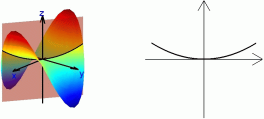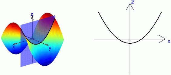 Cutting the surface by the plane y = c, a plane parallel to the yz-plane, produces parabolas the open upward.
