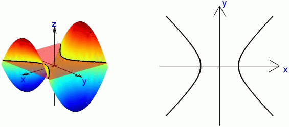 Cutting the surface by the plane z = c, a plane parallel to the xy-plane, produces hyperbolas. These are also known as the contours or the level curves of the surface. Notice when z = 0, two intersecting lines appear. Why do you suppose this is?