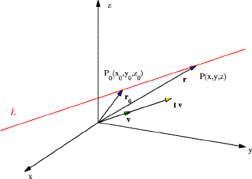 Suppose a point P0(x0, y0 , z0 ) is on a line L and we have a vector v that is parallel to the line L.  Let P(x, y, z) be any other point on the line.  Set